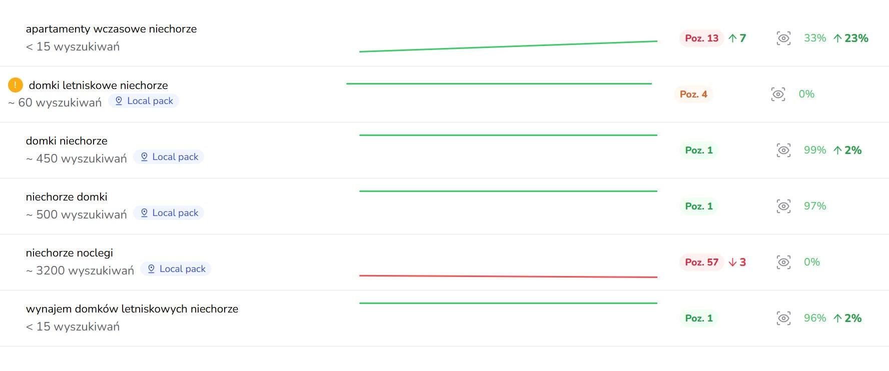Niechorze noclegi są najogólniejszą frazą z całego zestawu – konkurencją są tutaj wszyscy z Niechorza, którzy mają noclegi (nie tylko domki)- od wielkich pensjonatów, apartamentów, po mieszkania itd., więc tutaj wymaga ona o wiele więcej czasu i pracy.